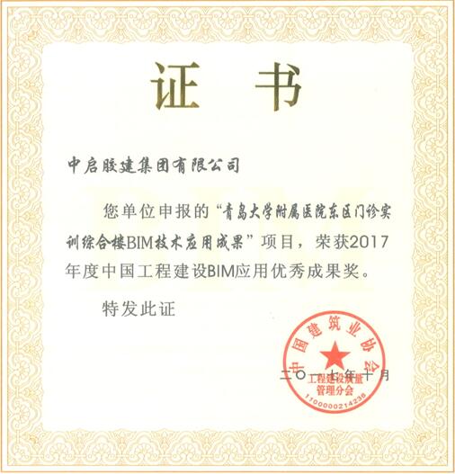 我公司青島大學附屬醫(yī)院東區(qū)門診實訓綜合樓工程榮獲2017年度中國工程建設BIM應用優(yōu)秀成果獎
