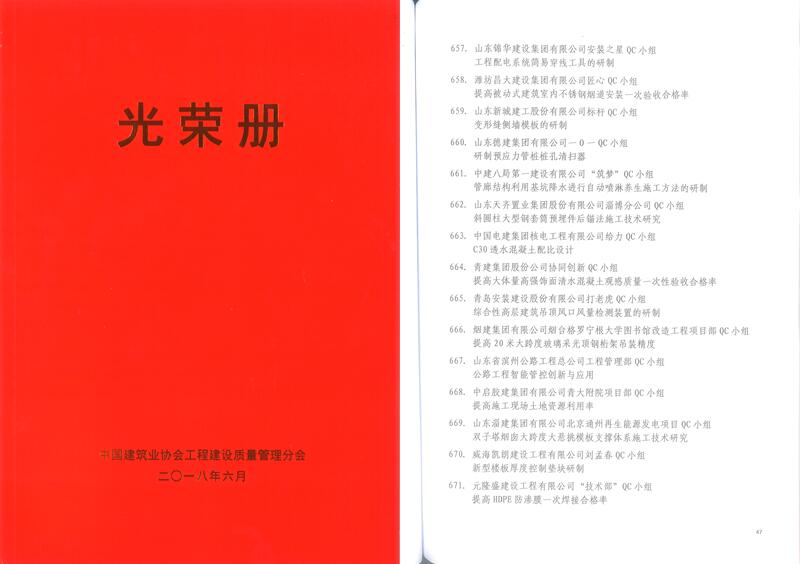 其中,7月1日,在中國建筑業(yè)協(xié)會組織的全國QC發(fā)布活動中,本成果以青島市第二名的排名在交流會上交流發(fā)布。本次中國建筑業(yè)協(xié)會QC交流活動不發(fā)證書,以光榮冊的形式下發(fā)獲獎成果。