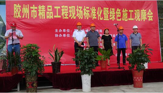 8月15日由膠州市城鄉(xiāng)建設局主辦的精品工程現(xiàn)場標準化暨綠色施工觀摩會在我公司施工的中啟大廈工程施工現(xiàn)場隆重舉辦。膠州市城鄉(xiāng)建設局副局長王世梅,膠州市經(jīng)濟技術開發(fā)區(qū)建設局局長姜大全,膠州市建筑工程質(zhì)量監(jiān)督站站長于清正,青島海大工程監(jiān)理咨詢有限公司董事長于洪波,中啟控股集團總裁郭道盛,中啟控股集團常務副總裁張增昌等領導以及全市施工、監(jiān)理單位的質(zhì)量安全分管領導、機構負責人、項目負責人、技術負責人等220余人參加了本次大會。