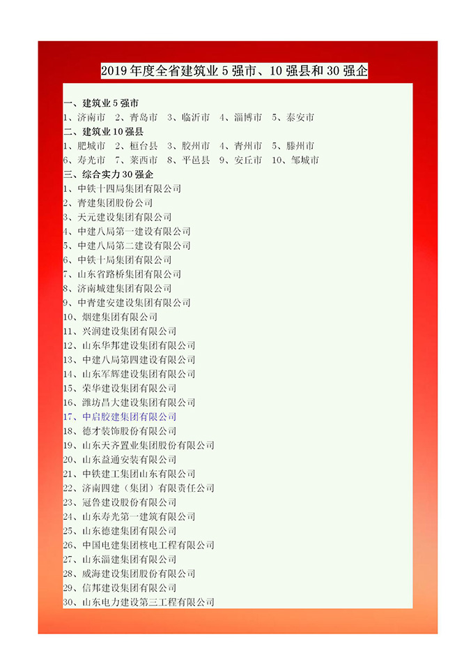 中啟膠建集團(tuán)榮獲“山東省建筑企業(yè)綜合實(shí)力30強(qiáng)第17位”