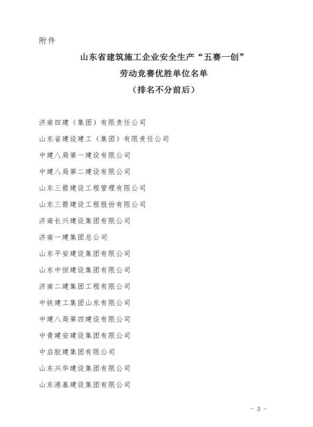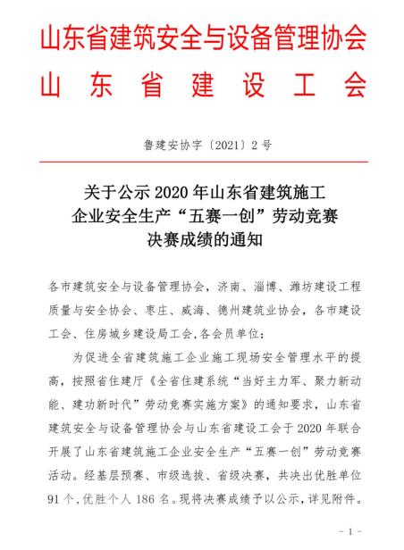 近日,山東省建筑安全與設(shè)備管理協(xié)會(huì)、山東省建設(shè)工會(huì)下發(fā)了《關(guān)于公示2020年山東省建筑施工企業(yè)安全生產(chǎn)“五賽一創(chuàng)”勞動(dòng)競(jìng)賽決賽成績(jī)的通知》,我公司經(jīng)過預(yù)賽、市級(jí)選撥、省級(jí)決賽,成功榮獲“山東省建筑施工企業(yè)安全生產(chǎn)‘五賽一創(chuàng)’勞動(dòng)競(jìng)賽優(yōu)勝單位”稱號(hào)。