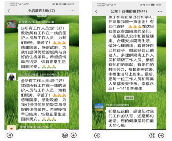 閉環(huán)管理中,人員是處于封閉狀態(tài)的,與普通隔離工作相比,存在的問題多,工作難度也更大。為了更好的服務(wù)每一位工作人員,酒店主動(dòng)建立微信群,了解工作人員的需求,群內(nèi)24小時(shí)都有人回復(fù),真正做到了有需求隨叫隨到。我們的工作性質(zhì)較為特殊,24小時(shí)倒班制成為了常態(tài)化,這樣也就決定了后勤保障也必須24小時(shí)跟進(jìn)。