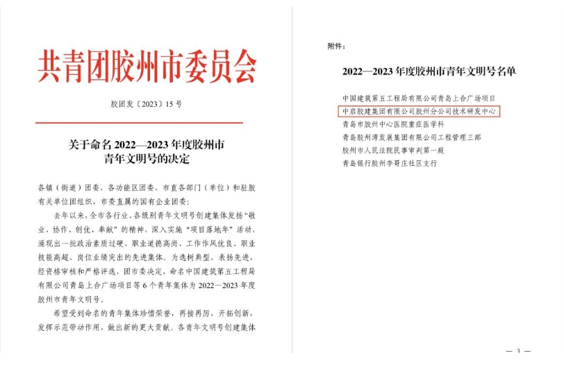 近日,共青團膠州市委發(fā)布文件,對全市“青年文明號”進行通報命名。中啟膠建集團有限公司膠州分公司技術(shù)研發(fā)中心被命名“膠州市青年文明號”稱號。