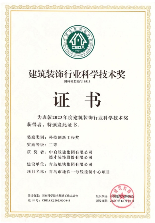 12月15日,中國建筑裝飾協(xié)會公布了2023年度中國建筑裝飾行業(yè)科學(xué)技術(shù)獎獲獎名單。由中啟膠建集團(tuán)建設(shè)的青島市地鐵一號線控制中心項目榮獲中國建筑裝飾行業(yè)科學(xué)技術(shù)獎(科技創(chuàng)新工程獎)二等獎。這是公司首次獲得該獎項,創(chuàng)中啟膠建集團(tuán)技術(shù)創(chuàng)新領(lǐng)域的先河。