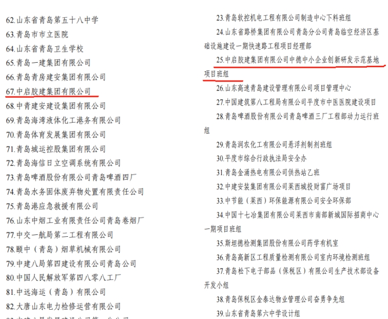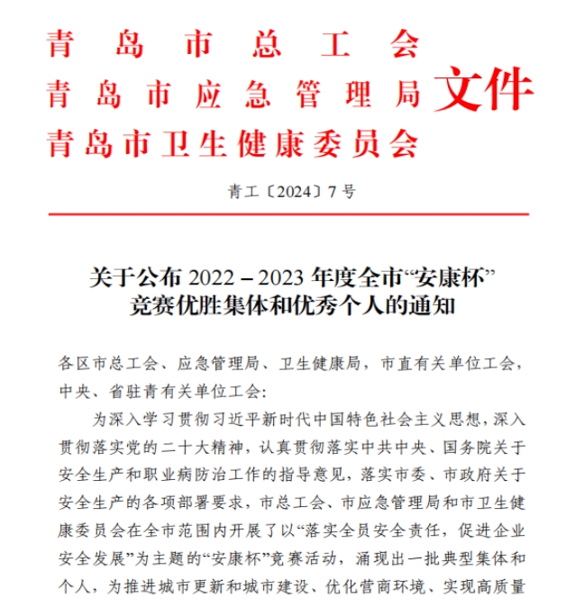 近日,青島市總工會(huì)、青島市應(yīng)急管理局、青島市衛(wèi)生健康委員會(huì)聯(lián)合公布了2022-2023年度全市“安康杯”競(jìng)賽獲獎(jiǎng)名單,中啟膠建集團(tuán)有限公司獲評(píng)青島市“安康杯”競(jìng)賽優(yōu)勝單位,中德中小企業(yè)創(chuàng)新研發(fā)示范基地項(xiàng)目班組獲評(píng)青島市“安康杯”競(jìng)賽優(yōu)勝班組。