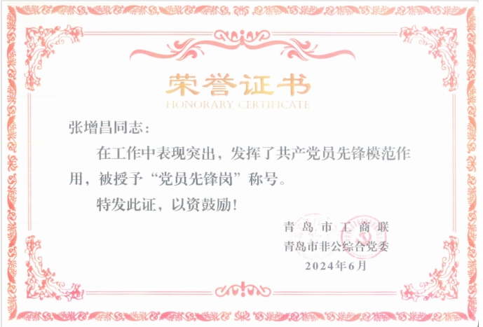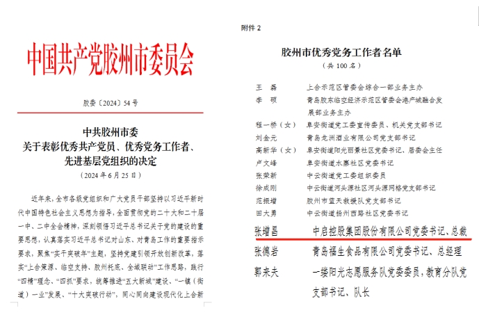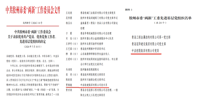近日,市各級黨委為表彰先進、弘揚正氣,激勵廣大黨員和各級黨組織牢記囑托、勇?lián)姑趹c祝中國共產黨成立103周年之際,通報表揚了一批優(yōu)秀個人和先進集體,集團黨委喜獲多項殊榮。集團黨委書記、總裁張增昌同志榮獲青島市非公經濟組織“黨員先鋒崗”和膠州市優(yōu)秀黨務工作者稱號;中啟膠建集團裝飾公司賈維敏同志榮獲膠州市委“兩新”工委優(yōu)秀共產黨員稱號;中啟控股集團黨委榮獲膠州市委“兩新”工委先進基層黨組織稱號;集團黨委所屬的中啟控股集團機關黨支部、中啟膠建集團膠州公司黨支部和中啟膠建集團青島公司黨支部獲評“2023年度膠州市五星級黨組織”稱號。
