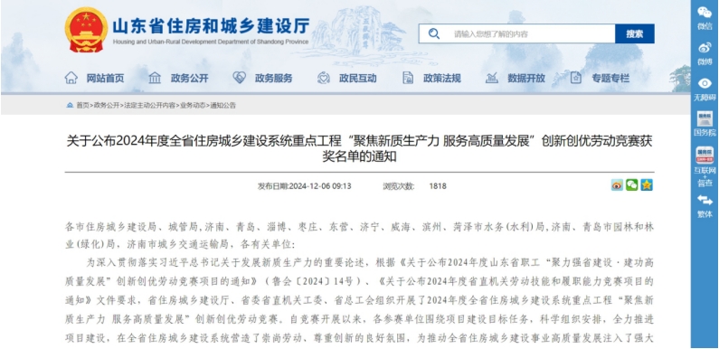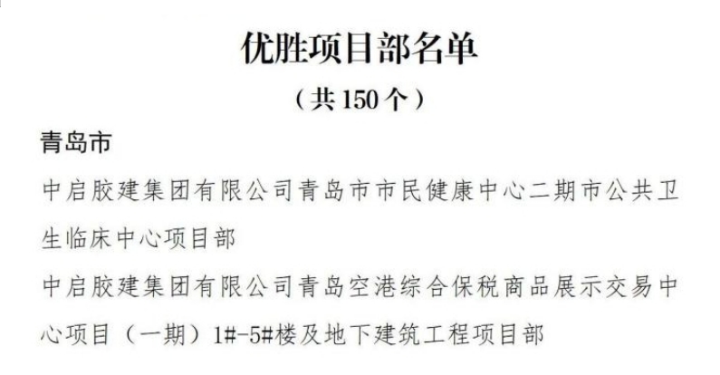 12月6日,山東省住房和城鄉(xiāng)建設(shè)廳官網(wǎng)公布了2024年度全省住房城鄉(xiāng)建設(shè)系統(tǒng)重點工程“聚焦新質(zhì)生產(chǎn)力 服務(wù)高質(zhì)量發(fā)展”創(chuàng)新創(chuàng)優(yōu)勞動競賽獲獎名單,中啟膠建集團有限公司榮獲“優(yōu)勝集體”稱號,青島市市民健康中心二期市公共衛(wèi)生臨床中心項目部和青島空港綜合保稅商品展示交易中心項目(一期)1#-5#樓及地下建筑工程項目部被評為“優(yōu)勝項目部”稱號。