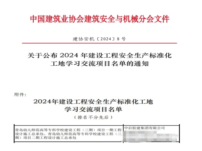 近日,中國(guó)建筑業(yè)協(xié)會(huì)建筑安全與機(jī)械分會(huì)和山東省建筑安全與設(shè)備管理協(xié)會(huì)公布了“2024年建設(shè)工程安全生產(chǎn)標(biāo)準(zhǔn)化工地學(xué)習(xí)交流項(xiàng)目”名單,公司承建的青島幼兒師范高等專科學(xué)校建設(shè)工程、青島經(jīng)控智聯(lián)谷二期項(xiàng)目、中德中小企業(yè)創(chuàng)新研發(fā)示范基地項(xiàng)目、棗莊市嶧城區(qū)人民醫(yī)院改擴(kuò)建工程建設(shè)項(xiàng)目獲得山東省建筑施工安全生產(chǎn)標(biāo)準(zhǔn)化工地學(xué)習(xí)交流活動(dòng)項(xiàng)目。其中,青島幼兒師范高等專科學(xué)校建設(shè)工程獲得全國(guó)建設(shè)工程安全生產(chǎn)標(biāo)準(zhǔn)化工地學(xué)習(xí)交流項(xiàng)目。