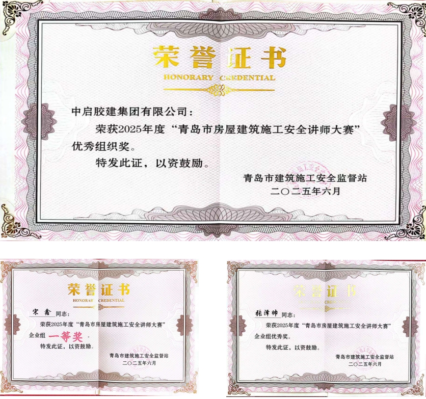 參賽組分為安全管理類、安全技術(shù)類、科技類,涵蓋了建筑施工安全管理、大型設(shè)備安全管理、高處作業(yè)、有限空間等類別。經(jīng)過篩選、預(yù)選、決賽,共評選出企業(yè)優(yōu)秀組織獎4個,企業(yè)個人一等獎2個、二等獎4個、三等獎6個、優(yōu)秀獎20個。集團選送參賽的兩位員工:華東公司宋鑫獲得企業(yè)組一等獎、膠州公司張澤帥獲得企業(yè)組優(yōu)秀獎。同時中啟膠建集團有限公司獲得“優(yōu)秀組織獎”。