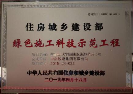日前,中啟膠建集團建筑七公司施工的中國海洋大學(xué)嶗山校區(qū)海洋科技中心樓項目獲得住房和城鄉(xiāng)建設(shè)部綠色施工科技示范工程授牌。